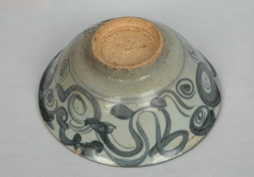 1.形制结构龙泉窑青花瓷盘胎体呈灰白色,挖足,并有放射状跳刀痕。足根由刀具切削修整而成,有尖削状和平削状,风格粗犷、简率,有的足根粘有窑砂。胎壁较厚,大大厚于景德镇窑口瓷器,特别是盘类口沿处更为厚实,并多有花口特征。可能因为龙泉窑胎土不如景德镇细腻、烧结度好,故龙泉窑盘碗类绝大多数胎体厚重,在窑内烧制过程中可以减少窑裂现象发生,胎体烧结度也不及景德镇青花瓷。