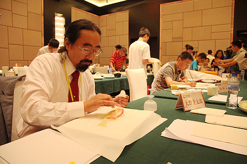 2、用拓包蘸深浅浓淡不同的颜色在宣纸上拍打