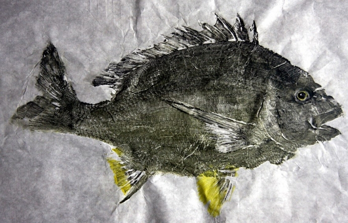 间接法与直接法的区别是,间接法的颜料不是涂抹在鱼身上,而是用拓包拍打在紧贴在鱼身上的宣纸上,很类似于进行碑拓的过程。