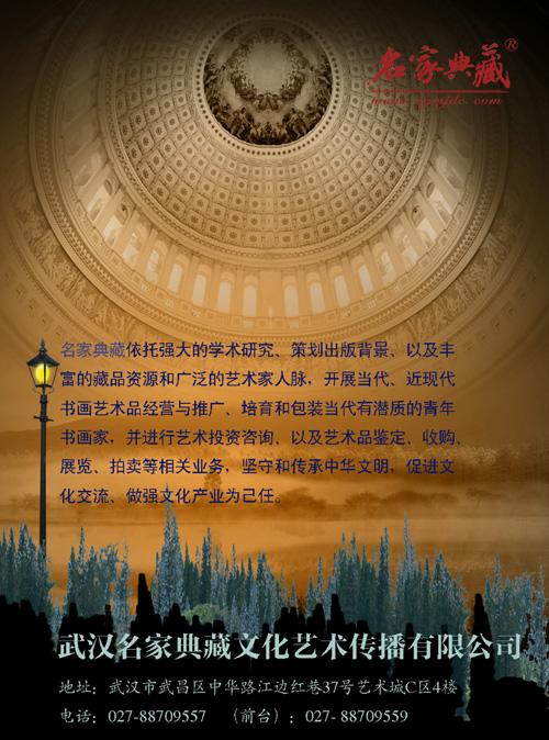武汉名家典藏文化艺术传播有限公司成立于2000年(原名“夕阳情”),是从事艺术品经营、收藏、推广和明星艺人包装及策划实施大型艺术品拍卖会和大型主题旅游活动的资深文化传媒机构,拥有全国知名(包括港台地区)的书画家、文艺家、鉴定家做本公司的学术主持和艺术顾问。