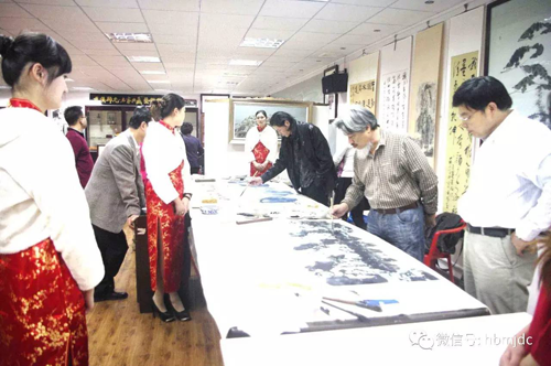 ▲ 2014年原湖北省文联秘书长聂为斌、著名花鸟画家彭太武在名家典藏文化笔会上欣赏丁竹君老师创作