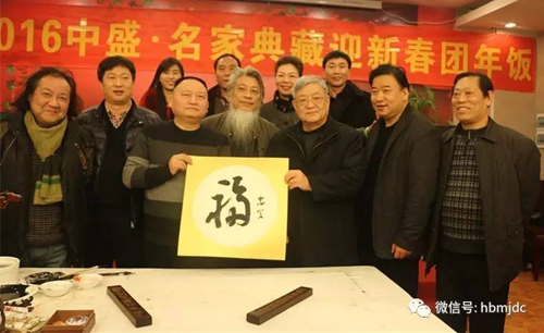 ▲ 原湖北省副省长、湖北省书法院院长韩忠学,丁竹君、名家典藏出品人郭建在2016年名家典藏团拜会上合影留念