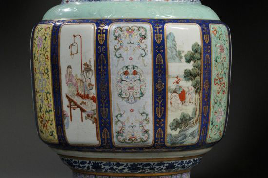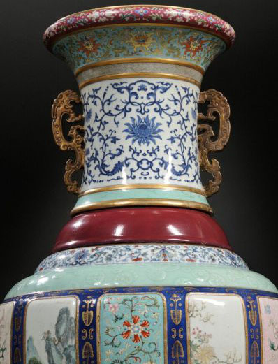 即将在美国上拍的瓷瓶,与故宫的各种釉彩大瓶颇为相似。在施以各色釉的瓶身上配以螭耳,其上有12幅长方形开光,,内绘粉彩吉祥图案,其中6幅为写实图画,分别为“三阳开泰”、“吉庆有余”、“丹凤朝阳”、“太平有象”、“仙山琼阁”、“博古九鼎”,另外6幅则为蝙蝠、如意、万字、螭龙、灵芝、花卉等吉祥图案。该拍品曾经过修复,局部出现裂缝和划痕。