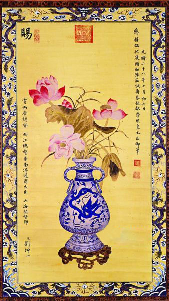 近日,在顺德盛世传承艺术馆举办的“明清书画大家展览”中,观众得以一窥慈禧太后墨迹。展览中展出的是慈禧在光绪二十八年赐予两江总督兼南洋通商大臣刘坤一的一幅绘画作品《瓶莲图》,钤印有“慈禧皇太后御笔之宝”。中国南方书画院副院长、国家文物局书画鉴定专家陆小明表示:“这幅作品使用的是加了黄颜色的熟宣,并请工匠给宣纸四边画了龙纹。此外,一般人很少在作品中盖这么大的印章,而且不会盖在正中间,只有皇帝才会这么做,皇帝认为自己天下第一,所以会把印盖在‘天’上。”
