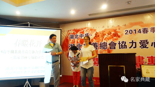 罗毅董事长现场为艺术生代表发放慰问金 2014年6月1日下午两点,春暖花开2014春季湖北慈善总会协力爱心助学基金名家书画专场拍卖会、湖北中盛名家典藏2014春季艺术品拍卖会于武昌保利大酒店举行,数百名市内外的书画爱好者和收藏家参加拍卖会。春暖花开慈善拍...