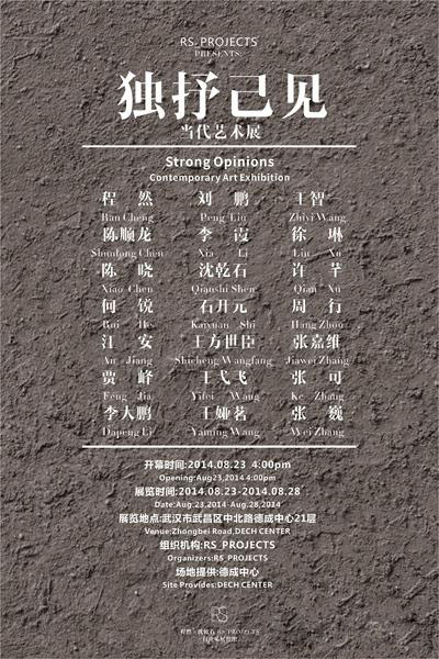 RS_PROJECTS在展前与受邀艺术家们经过细致的讨论,对展务达成了相当的共识。通过策展人与艺术家双重的努力后经过多次修正,决定将「独抒己见Strong Opinions」作为本次邀请展一题。我们愿意尝试通过策展人与艺术家同时针对第三方(中北路德成中心尚未完成装修的21层)进行平行讨论时,能促使艺术家更主观有趣、更加新鲜的观点。而通过此种自发、自组织的艺术家内部讨论与规划达到不用策展人做策展的策展,以独抒己见。