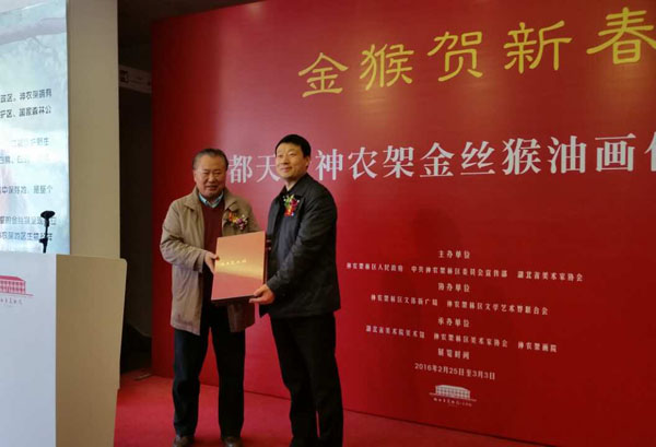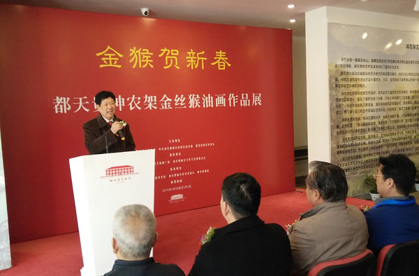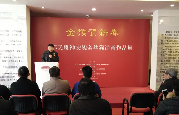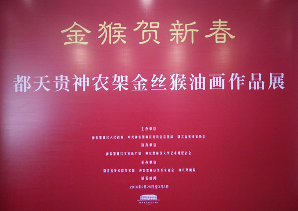 2016年2月25日上午10点,“金猴贺新春---都天贵神农架金丝猴油画作品展”在湖北省美术院美术馆隆重开幕。这是由神农架林区人民政府、神农架林区党委宣传部、湖北省美术家协会主办,神农架林区文体新广局、神农架林区美协协办,湖北省美术院美术馆、神农架美术馆承办的高规格的一次画展,凸显了著名画家都天贵长期扎根基层,对国家重点保护动物——金丝猴的细心观察,从另一角度以油画的语言创作出的高水准的系列作品。