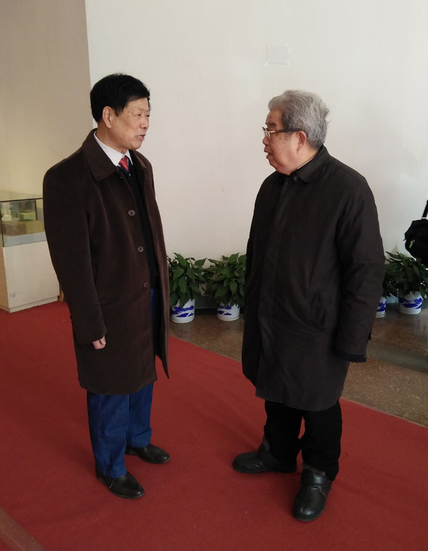 原湖北省美术院院长、著名画家陈立言与画家都天贵在愉快的交谈