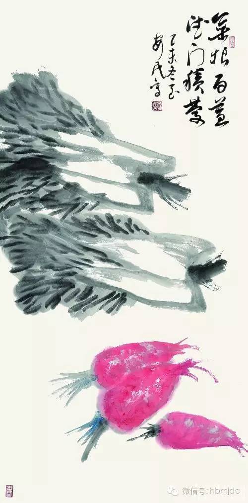 孙安民的大写意花鸟画题材广泛,梅兰竹菊、牡丹墨荷、瓜果蔬鲜,无所不精。这次展出的孙安民二十几幅作品中,既有恩师笔意的白菜,清润雅致的兰竹、墨色淋漓的荷花、雍容华贵的牡丹、又有苍劲拙朴的松柏和绽放枝头的梅花。