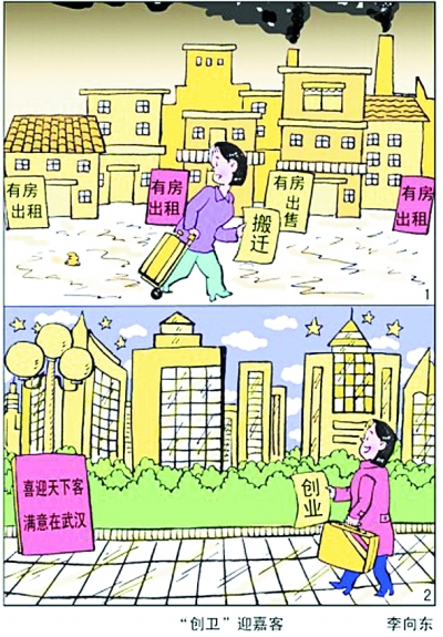 在众多作品中,大多数参赛者都描绘了武汉创卫后的变化。江汉大学设计学院动画教研室的李冀同学,用拟人手法为“武汉”设计了四格漫画,展现了她心目中的创卫主题——“武汉”是一个男孩,从他的衣着及环境改变,表现了武汉“创卫”带来的变化。以前男孩子家乱、人脏,通过不断提档,现在家美、人帅,“武汉”越来越让人喜欢。