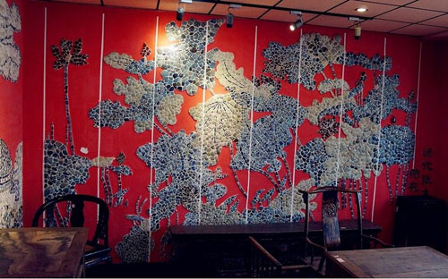 房子里有不少这样用瓷片拼成的名画。此画为张大千名画,用元明清三代青花瓷拼成,据称红色的瓷片烧制技术现已经失传。