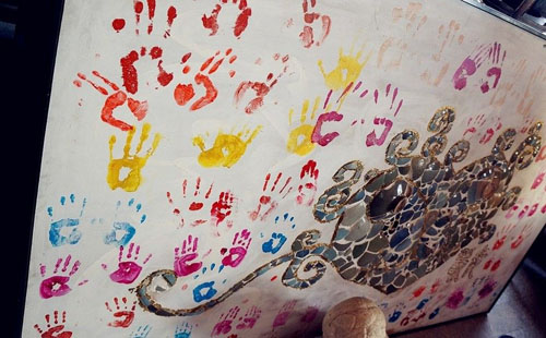 一幅由瓷片制成的名为慈母心的画。