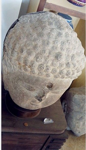 图为房子内展出的一个约1600年前的佛头雕刻,价值约为1.5亿元