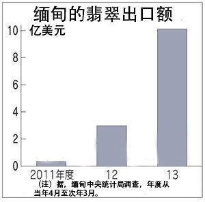 缅甸是全球最大的翡翠出产国,同时还盛产红宝石等宝石。据缅甸中央统计局调查,2013年度的翡翠出口额为10亿1160万美元,增至12年度的3.4倍,占13年度缅甸出口总额的10%。据称大部分翡翠都出口到了中国。