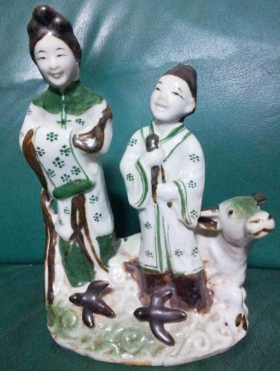 醴陵釉下彩出自湖南,曾在民国时盛极一时,有“白如玉、明如镜、薄如纸、声如磬”之美誉。图中所示“醴陵瓷像牛郎织女”高18厘米,底座长14厘米。人物形象栩栩如生,造型完整,瓷质细腻,釉色滋润,手感舒服,清新雅丽,别具一格。