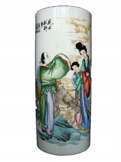 兴起于清朝咸丰年间的帽筒兼具实用性和观赏性。其时人家嫁女,帽筒是必备的嫁妆之一。图中所示帽筒为民国旧物,其高28厘米,口径12厘米。筒壁绘《牛郎织女鹊桥相会图》。只见牛郎双手抱拳,眼含深情注视织女,而头梳高髻的织女,也是眉目含情。两人中间是爱情的见证—老牛。此帽筒粉彩漂亮,纹饰精美,画工精细,色彩舒雅。
