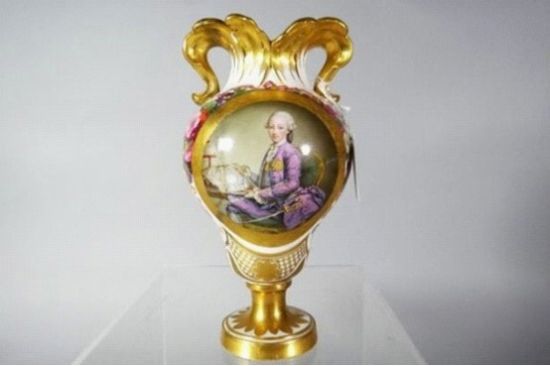 拍卖的花瓶展示由1730年起成为萨丁尼亚国王查尔斯。埃曼努埃尔三世的肖像。该花瓶曾被打破,摔成6块碎片,后来用超能胶黏合。