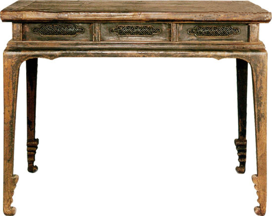 造型高古,由供桌演变而来,但下部做了减重设计,可以一器多用,约为明代中期制作。其桌面较宽,长宽之比小于2∶1,尺寸属于画桌,可以站前挥毫作画。造型为宽喷面,冰盘沿,高束腰;腿木贯顶,加大了抗拉的强度;束腰间饰透雕万字锦绦环板和起灯草线的立柱;下为托腮和牙板,牙板瘦窄,两端与桌腿弧形交接,边饰灯草线;桌腿收窄,下作卷草式底足。