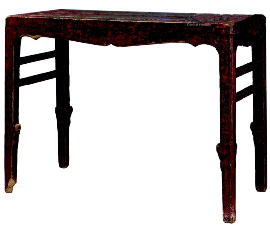 高83厘米,长160厘米,宽61厘米。其造型为三板下卷式,简洁、轻便至极,易于携至采光良好的窗前、户外进行阅读、写作或弹琴之用;两侧壸门式的开光和挖缺足即可减重,又形成了曲线美,体现了明人的家具设计理念。这种造型最适于用软木制作,施以蔴灰漆饰,既轻且牢,年久断纹生出,古趣愈浓。此几之漆呈朱膘色,似用丹砂颜料。《髹饰录》第76条杨明注云:“又用丹砂者,暗且带黄”。丹砂不及银硃鲜丽,因此,在调漆时为欲鲜亮,常漆少油多,受岁月侵蚀的老化程度甚于同期的银硃大漆,年代容易早估,此桌的制作年代约在明代后期。