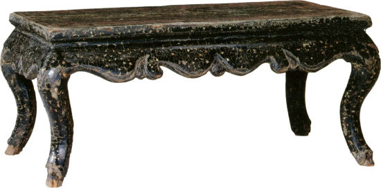 明代人的饮食习俗为分桌而餐,故每家都有多张肴桌或酒桌,而且它又可以充当书桌、供案,用途甚广。桌案的损坏率要低于椅凳,所以明代小型桌案的存世相对较多。除了造型及纹饰以外,我们还需掌握的鉴别要点有:明代的桌案多带有拦水线,它不光具有阻拦汤水流溢的功能,而且可以抵挡日常磕损,使桌案面的漆麻灰层不易揭起剥落,较早期的拦水线常与桌案面的四边一木连做。