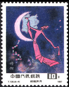 此外,嫦娥奔月的传说还在我国的邮资票品上多次展现:1987年发行的《中国古代神话》(T 120)第4枚和1999年3月发行的《汉画像石》(99-2T )第6枚就是《嫦娥奔月图》,1995-19《国际邮票、钱币博览会,北京1995》“桂花”小全张边纸上即是“嫦娥奔月”,1998年11月12日发行的Y J1《中国1999世界集邮展览》邮资邮简一套2枚,第2枚邮简图为《嫦娥奔月图》。