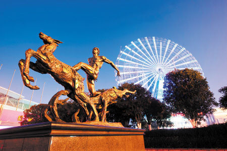 摩天轮下,奔跑不止、运动不息的《人与自然》组雕,将运动的人与动物放在一起,体现了竞技体育的精神,也见证着这个城市的发展。