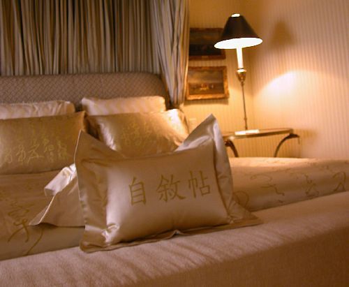 其中,“自叙帖”寝具,在岛内高级饭店台北西华饭店的总统套房就有装置。据报道,“自叙帖”寝具从怀素以狂草体写的《自叙帖》中撷取精彩段落,共64行字进行创新排版,在真丝上展现草书的动感笔触。业者说,这套寝具研发期间长达一年半,前后修改了七八次,每次都要重新制版,用在开发的费用就达三四十万元新台币。
