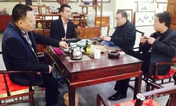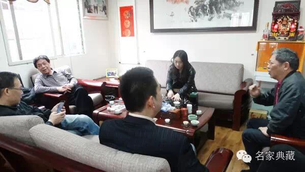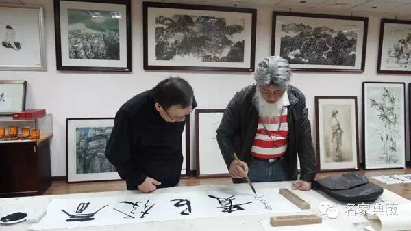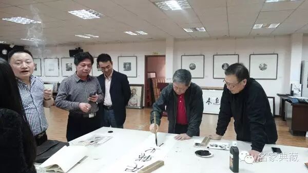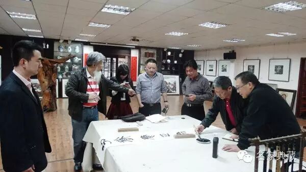 著名山水画家、篆刻家詹志峰、著名山水画家丁竹君来访名家典藏馆,武汉市红十字会会长舒汉明、汉正街控股集团公司副董事长易发贵陪同。一行在馆内茗茶餐叙,詹老师和丁老师一时兴起,在艺术馆提笔挥毫,写下数幅书法作品。