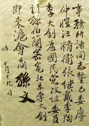 1924年,在苏俄的帮助下,国共第一次合作,中国共产党以个人身份加入国民党,从而帮助孙中山改组国民党。这是孙中山写的手信,主要内容是要请李大钊来上海会商事宜。那个时期很多共产党早期领导人都成为了国民党党员,并且进入了当时的国民党中央。毛泽东同志也成为了国民党中央宣传部代理部长。但好景不长,随着孙中山的逝世,国民党各派的日益“反动化”,最终第一次国共合作失败。