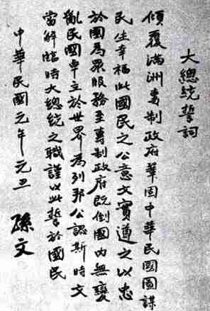 1912年1月1日,孙中山在南京宣布就职,成立中华民国临时政府。此为《大总统誓词》。民国时期当选总统都要进行宣誓,而新中国则在近期规定,新当选的政府首长要向宪法宣誓,来表明宪法在人民中的地位,以及依法治国的理念。从文中可以看出,当时已经提出政府“图谋民生幸福”、“为众服务”。也可以看出当时革命势力的软弱,“至专制政府既倒,国内无变乱,民国卓立于世界,为列邦公认”,这时,“文(孙文)当解临时大总统之职”。在任职的时候就想着辞职的事情,也只有在那个时代才有的事情吧。