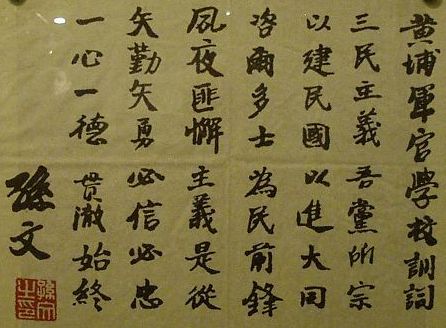 1924年,孙中山也在总结每次革命失败的经验,归其一点,就是没有自己的军队,导致国民党软弱,从而不断地寄希望于封建军阀,企图改造他们成为民主人士。但屡次失败也让孙中山明白,没有自己的军队,革命不可能成功。所以之后创办了黄埔军校,为的就是培养出属于国民党自己的军队。这是孙中山先生手写的《黄埔军校训词》。从他的反思中,也印证了毛泽东之后的一句话:枪杆子里面出政权。