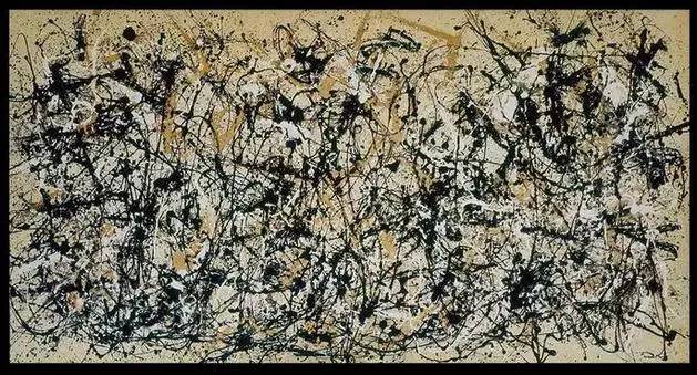 1947年波洛克开始使用“滴画法”,把巨大的画布平铺于地面,用棒或画笔把颜料滴溅在画布上。其创作不作规划,作画没有固定位置,喜欢在画布四周随意走动,以反复的无意识的动作画成复杂难辨、线条错乱的网,人称“行动绘画”。此画法构图设计没有中心,结构无法辨识,具有鲜明的抽象表现主义特征。