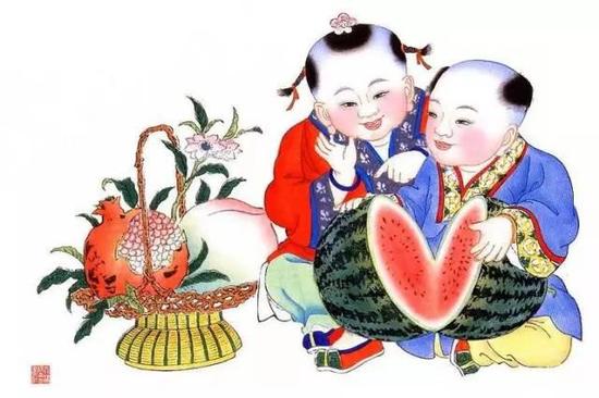 “西瓜”也代表“多子”,所以这张的寓意也是“多子”、“长寿”。