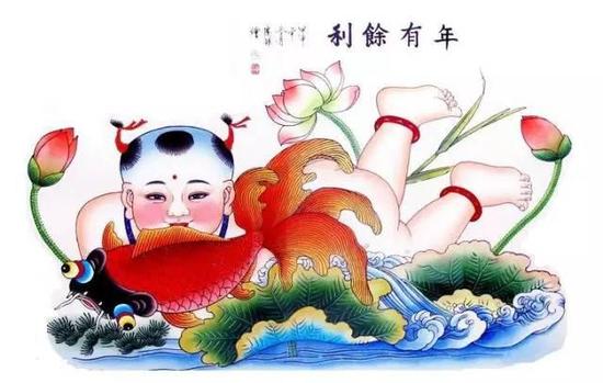 但也有特殊情况,有时候一种事物还可以代表一个副词,比如这张图示为“年有余利”的年画,其实还可以称为“连年有余”。画中的“莲花”代表一个连续类副词。画中的鱼也不是普通的金鱼,而是一条“鲶鱼”,合起来正好是“连年余”,所以称为“连年有余”。