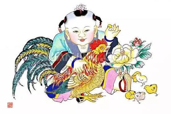 这张浅显易懂,怀里的“公鸡”和手中的“栗子”,代表“大吉大利”。一般来说,一种表征性的事物,代表一个特指的汉字,这样连成一句祝福的成语或俗语。