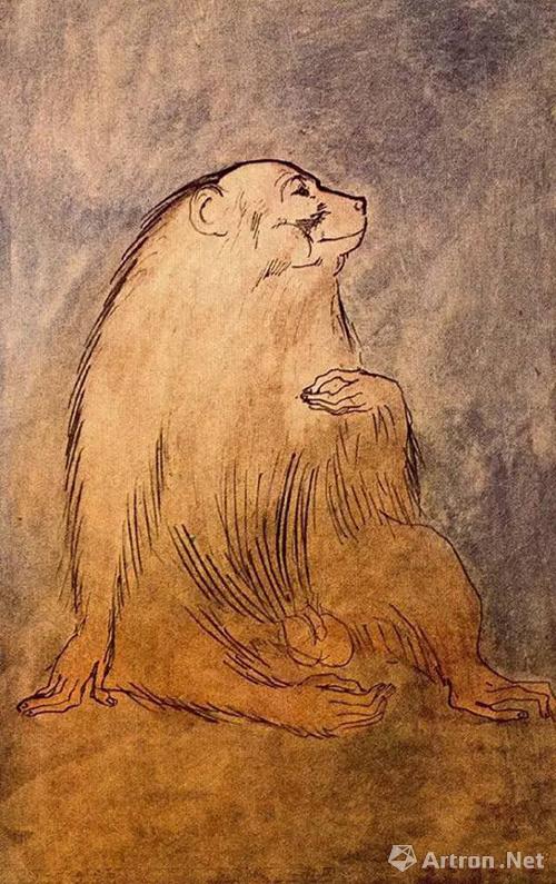 笔者找到毕加索的三个灵长类动物形象作品,第一张是粉红色时期《坐着的猴子》,明快的线条使猴子惟妙惟肖,竟然还有一丝不易察觉的可爱笑容。