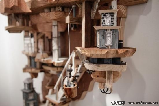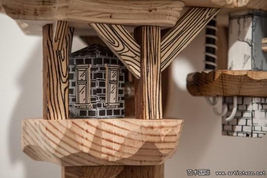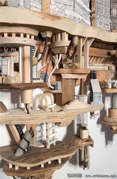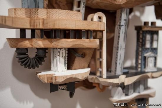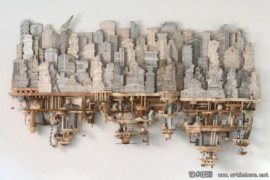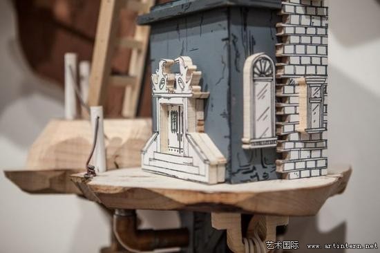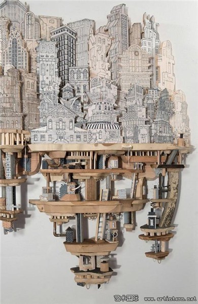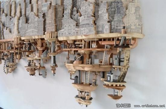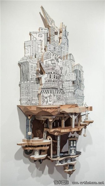 “我的作品主要表达建筑环境与地下系统之间复杂的交集。通过丝网印刷技术,将绘画作品打印到木头、金属以及其他平整的材质表面,再将其雕刻出三维形状”Luke O’Sullivan讲到:“我尝尝受到反乌托邦思想以及科幻电影的灵感启发,将现实中的建筑形象与想象中的建筑构造结合,制造出类似西洋镜式的场景模型”
