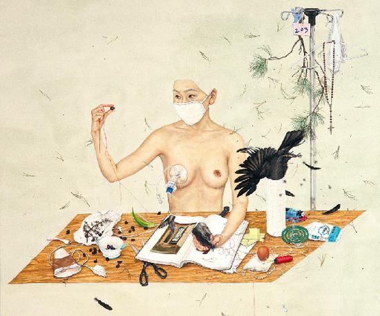因为深受韩国传统文化的影响,并与自己的创作概念保持一致,珍珠只使用传统的韩国绘画材料进行创作。“其实我也可以用油画,但韩国传统材料更加符合我绘画的概念及想要表达的内容。我实际上也试过很多种材料,比如在油画布上涂满厚厚的油画颜料,也可以制造一种具有东方韵味的肌理感。我现在用的颜色几乎都是用水来调和或稀释的,我想这更符合我个人创作的概念,也更具有东方的感觉。”在珍珠的绘画内容上,灵感大都来自日常生活中,某些能够引起一些特殊记忆的事情。她说:“我对记忆非常感兴趣,我的作品大都在描绘这方面的内容。所有那些在周遭的,不断存在的,并不断重复的,更是在记忆中的那些唤起心理或肉体不舒服与痛苦的经历。在我的作品中,也会详细呈现我在早年时候被诱拐的难忘经历,还有在我大学期间发生的一些对我有很大影响的事情。这是一种纪念,回忆所有我生命中裂痕的方式,通过画面,洞察出反射真实内在心理的图像。”在珍珠的个人绘画作品里,故事情节体现的是纯粹的个人观点。这种个人观点并非指宏观的,或社会性的论题,而是来自宏观性情节,或某个片段里,更具个人性的内容。“不管怎样,我觉得我作品里的这些情节,有意无意地都会反映我们的社会体系。我是这样觉得。”珍珠说道。