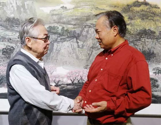 2015年,张善平主席与董继宁院长在《江山万里行》画展开幕式上亲切握手