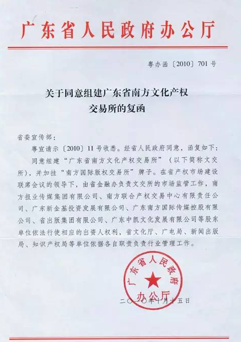 可查阅广东省政府网站中关于南方文交所的索引(http://zwgk.gd.gov.cn/006940079/201104/t20110429_50087.html),在公开的政府文件中明确地指出,南方文交所是拥有南方报业集团等国有企业的官方背景。