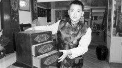 ▲黄天龄展示其藏品丙市怡昌饷当的钱箱。 ▲黄天龄所藏玻璃反画《三星图》 ●本报记者曾秋玲 在梅城江南鸿都康居路,聚集着五六十家古董店。黄天龄的心耕堂就是其中一家。精美的木雕、陶瓷,典雅的对联、牌匾黄天龄身穿金色唐装马褂,脚蹬黑色布鞋,宛如民国...