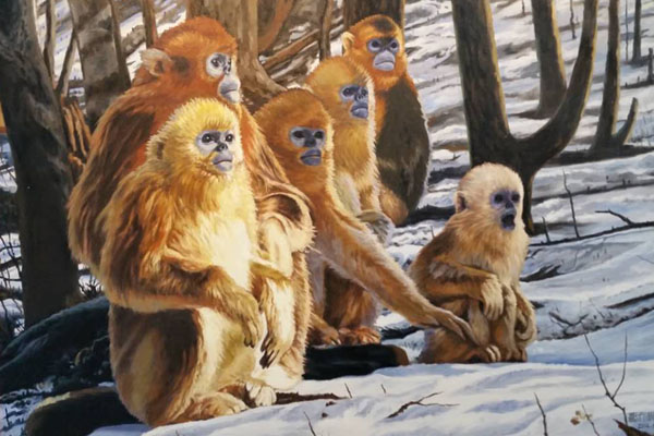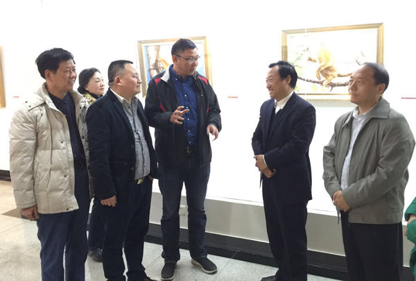 2月29日下午4点,湖北省人大常委会常委、省人大民族宗教侨务外事委员会主任委员谭徽在莅临“金猴贺新春-都天贵神农架金丝猴油画作品展“现场参观指导工作。湖北省美术院美术馆馆长欧阳强、神龙架林区画院院长都天贵及夫人、名家典藏文化艺术机构董事长郭建等陪同。