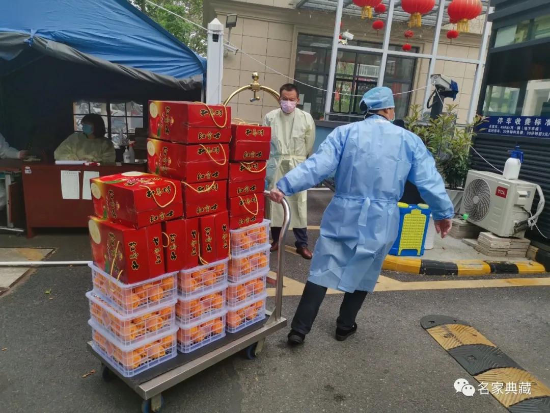 当天上午,市社会福利院福利路侧门门口,院方工作人员戴着口罩、拉着安全绳,值守在门口。武汉名人协会会长郭建,正带领协会工作人员,把一箱箱的水果和印有感恩字样的酒水等慰问物资从面包车上卸下来,转交到武汉市社会福利院工作人员手上,请冯院长转赠给福利院的老人和孩子们品尝,以表达在疫情期间对院内老人们一份关怀之情,并祝老人们幸福健康、节日快乐。