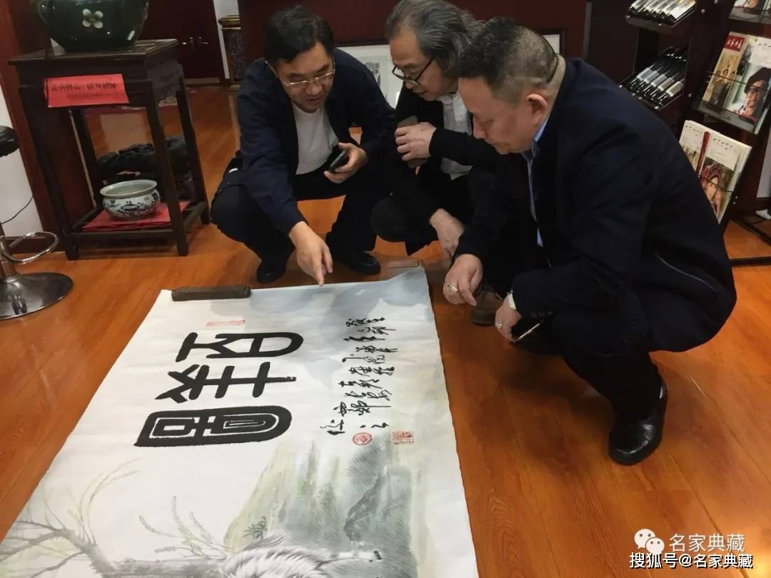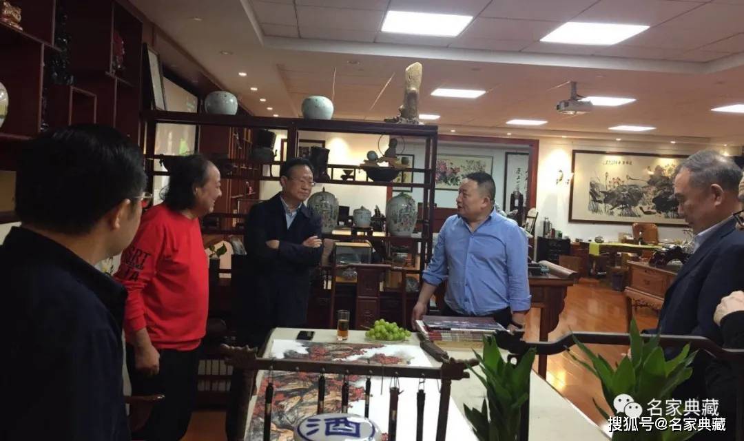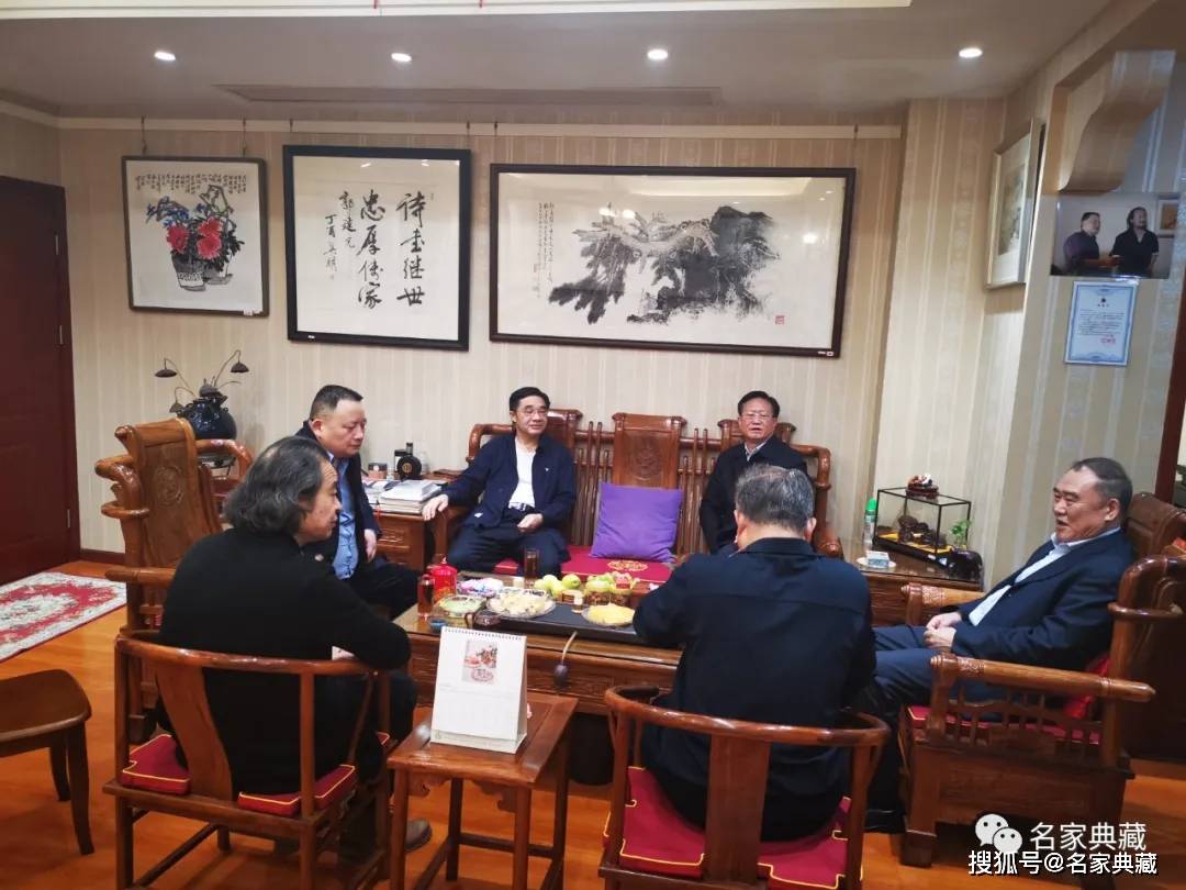 黄文平主任、张传斌社长和郭建会长在名家典藏艺术馆内品鉴藏品
