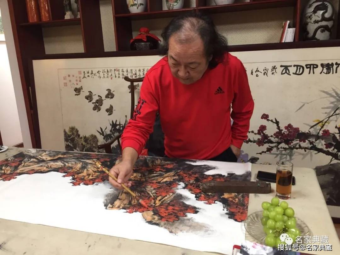 李小白老师现场创作的国画《峡江秋染漫山红》