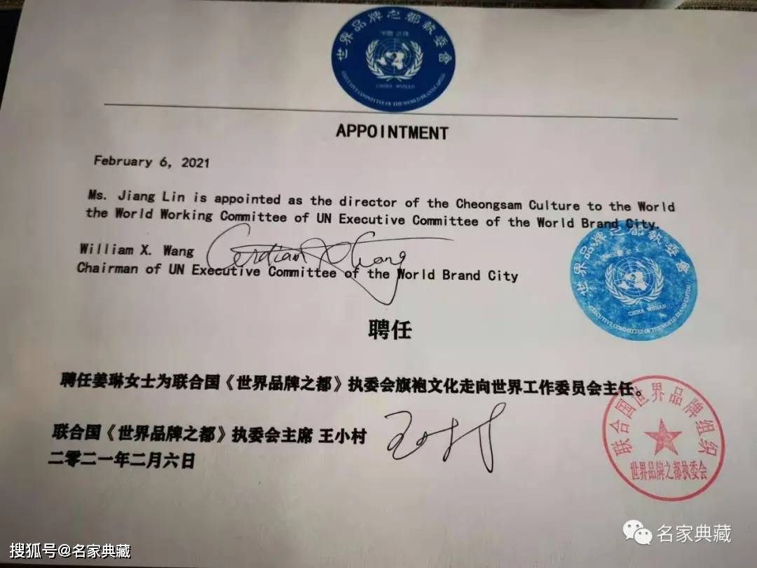 ▲ 2021年2月6日,武汉名人协会副秘书长姜琳被聘为联合国《世界品牌之都》执委会旗袍文化走向世界工作委员会主任。联合国世界品牌组织科学委员会主任、《世界品牌之都》执委会主席王小村为其颁发了聘书