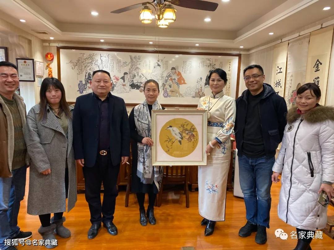 ▲ 武汉知名工笔画家张冰老师(左四)老师向武汉名人协会赠送作品《秋月》,并与郭建会长、廖波副会长、姜琳副秘书长、丁雪宝主任等一起合影留念;祝大家的事业蒸蒸日上、生活花好月圆