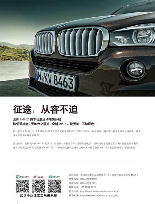 即日起至9月30日,全新BMW X5购车优惠活动将在BMW武汉中达江宝开展。在此期间,购车客户将享受多重专属礼遇,尊荣备至让您的征途愈显从容!
